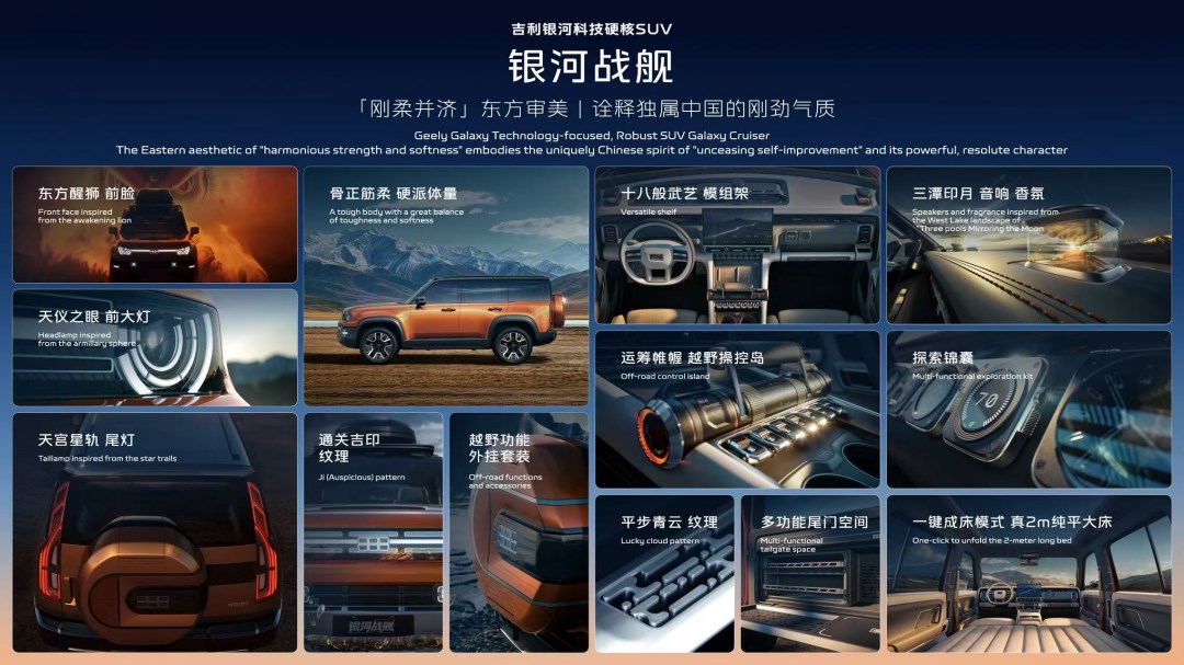 發(fā)布會(huì)上,吉利智能安全科技的集大成者——銀河戰(zhàn)艦迎來全球首發(fā)。銀河戰(zhàn)艦在設(shè)計(jì)上不僅展現(xiàn)了“剛?cè)岵?jì)”的東方審美,更詮釋了獨(dú)屬于中國(guó)人“自強(qiáng)不息”的剛勁氣質(zhì)。形似“渾天儀”的前大燈、勾勒“天宮星軌”的尾燈,靈感來自“游艇操縱桿”的越野操控島等設(shè)計(jì)等,均展現(xiàn)了吉利銀河“漣漪美學(xué)”在智電時(shí)代的硬派表達(dá)。