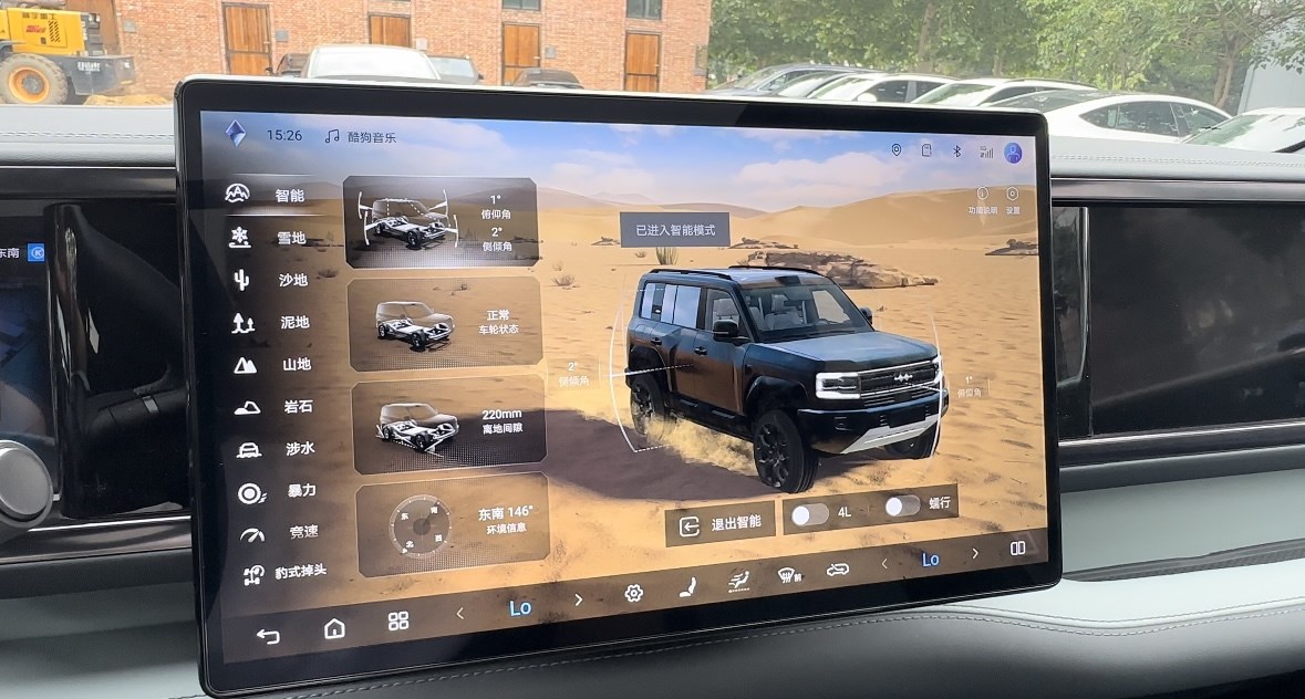在駕駛模式方面,新車擁有多種模式,智能、雪地、沙地、泥地、山地、巖石等等,每一次駕駛模式的切換,不僅僅是轉向、油門上的變化,屏幕上也會進入到相應的情景模式當中,彷佛如臨其境一般,情緒價值直接拉滿。